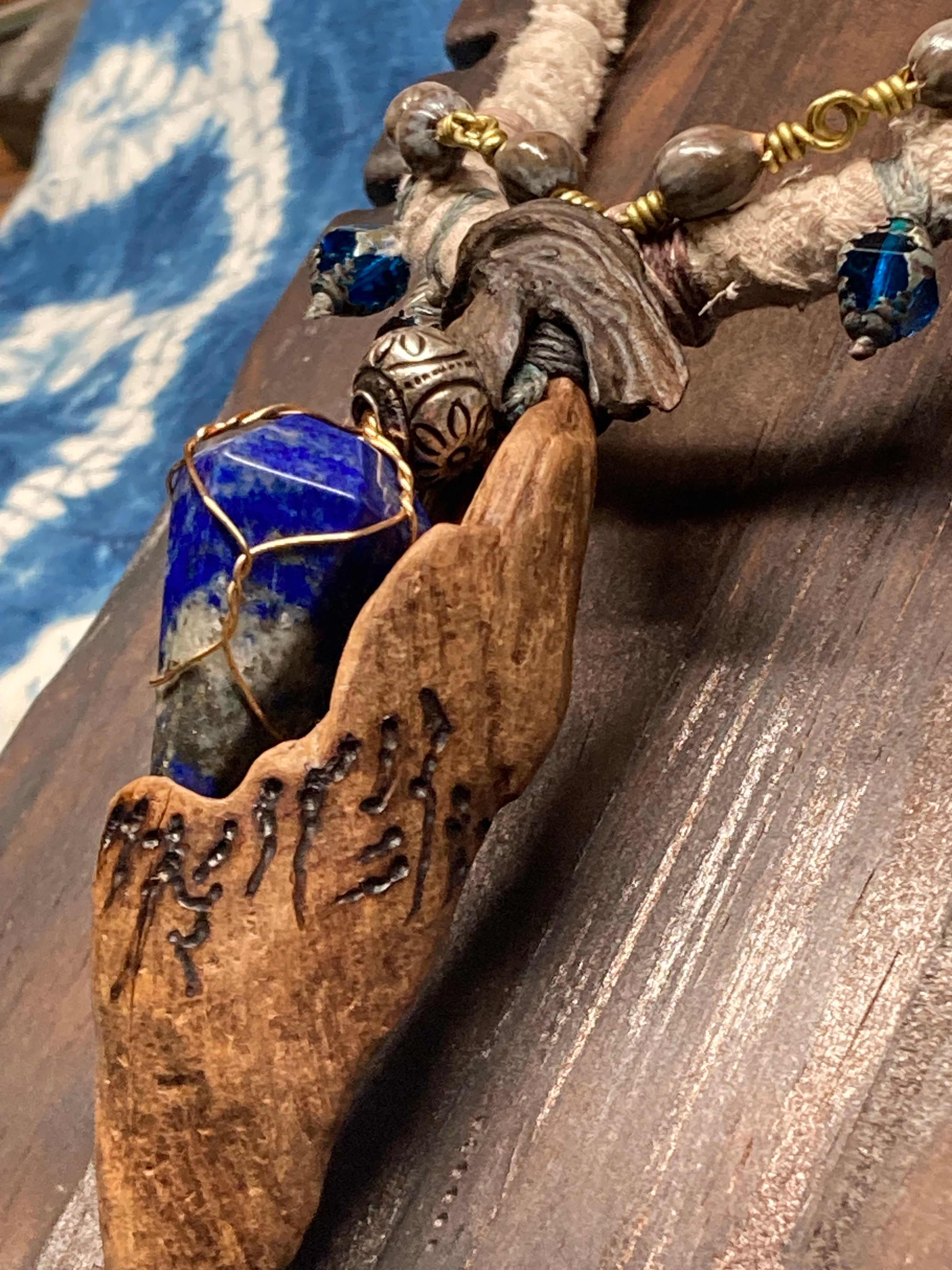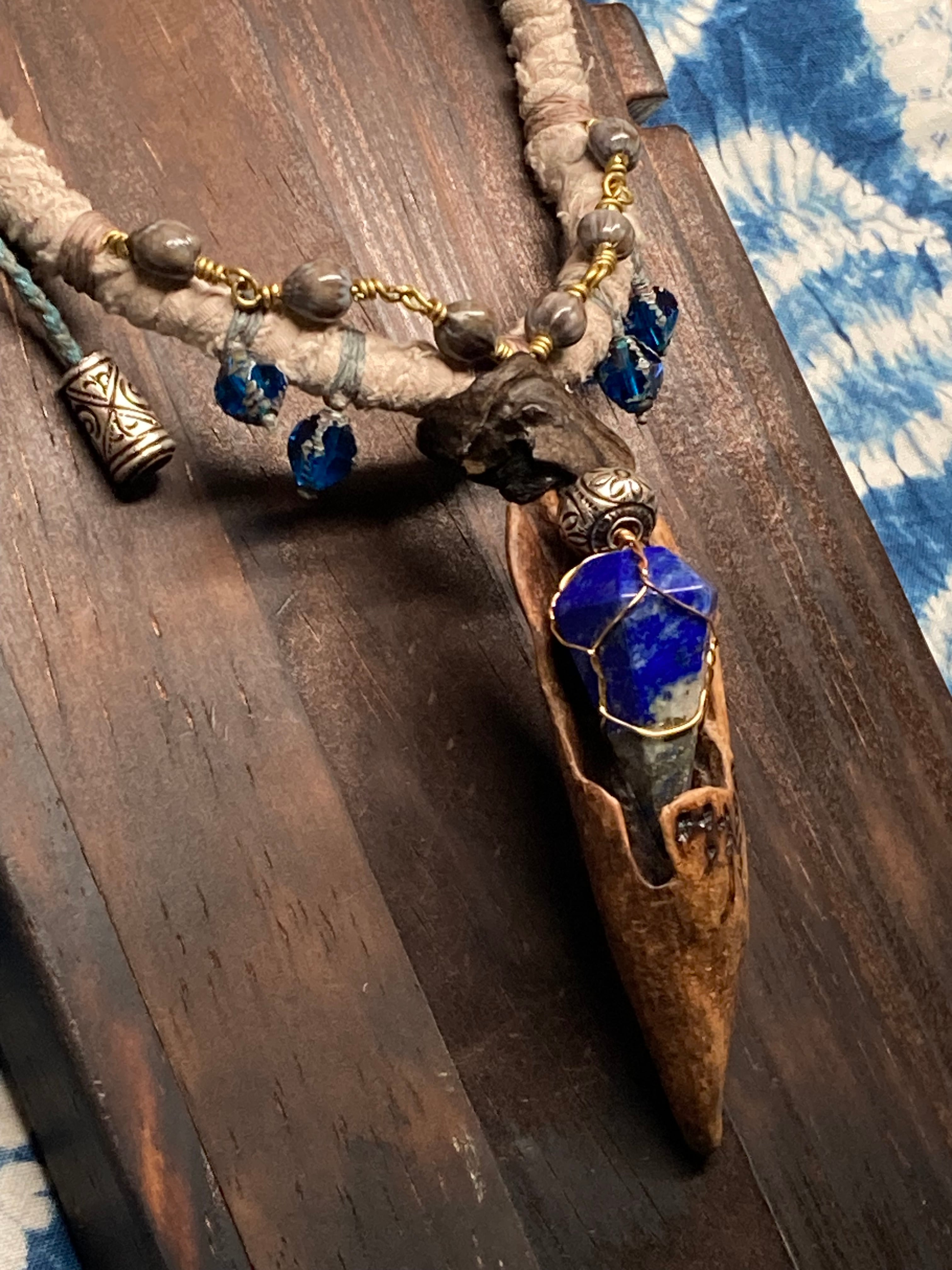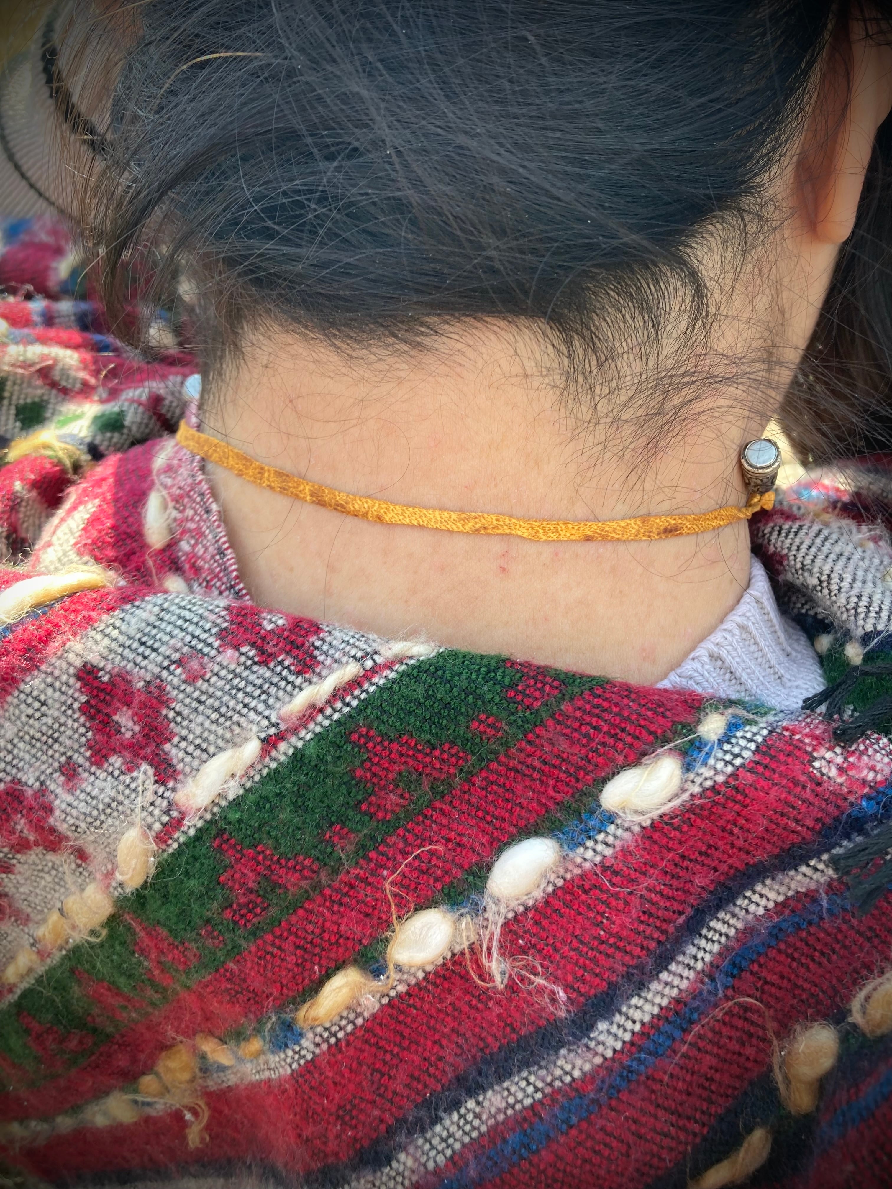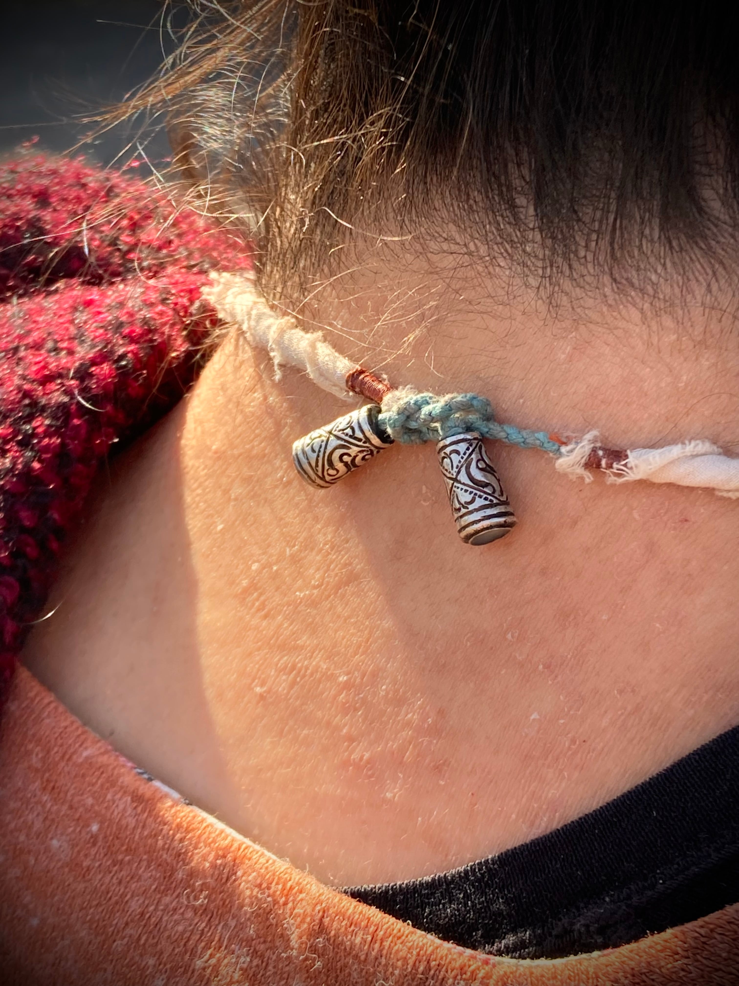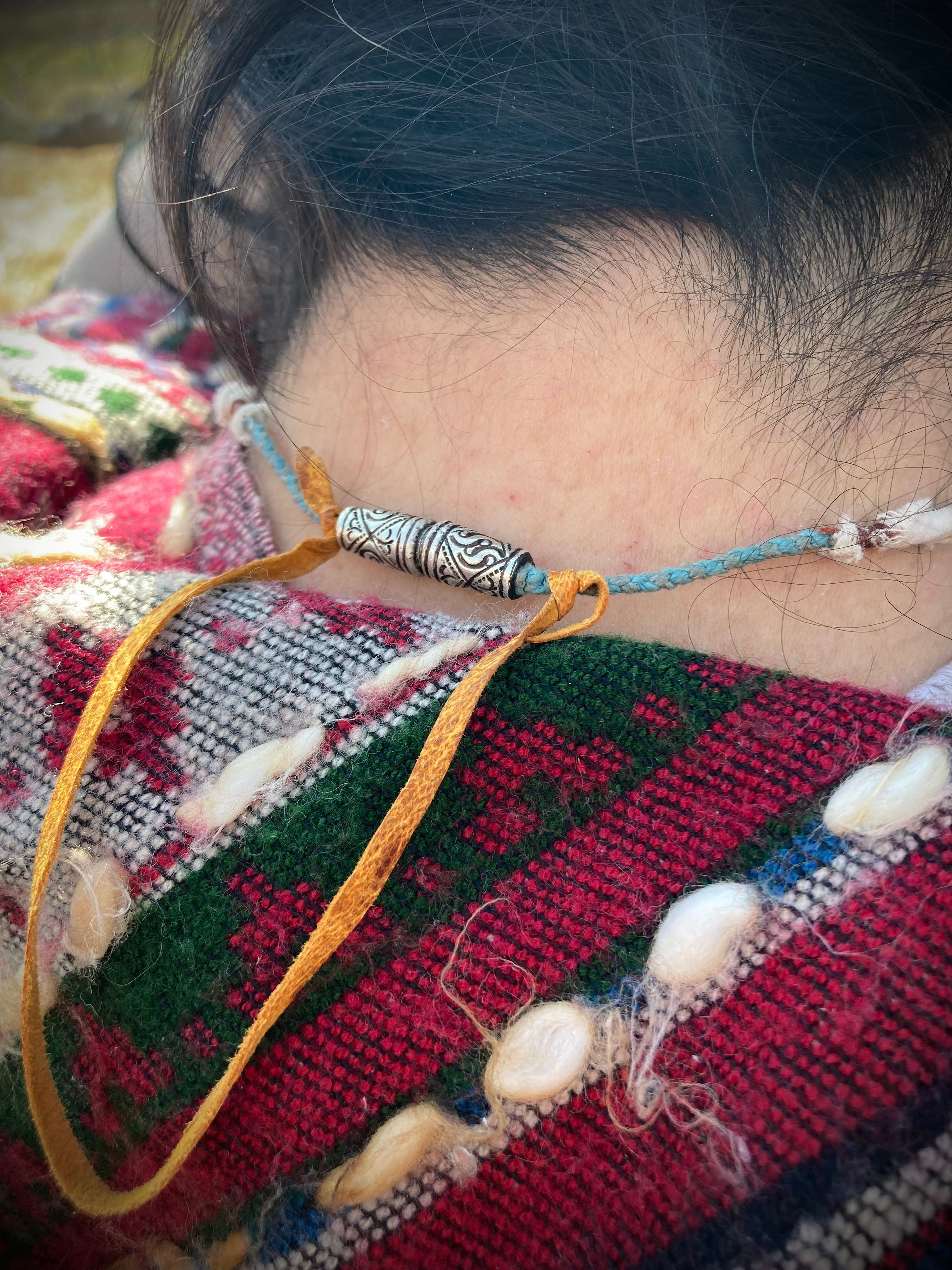 A hand-twisted cord, wrapped with fragments of aged cloth, and adorned with just a few beads and silver parts. It balances humble textures with quiet power.