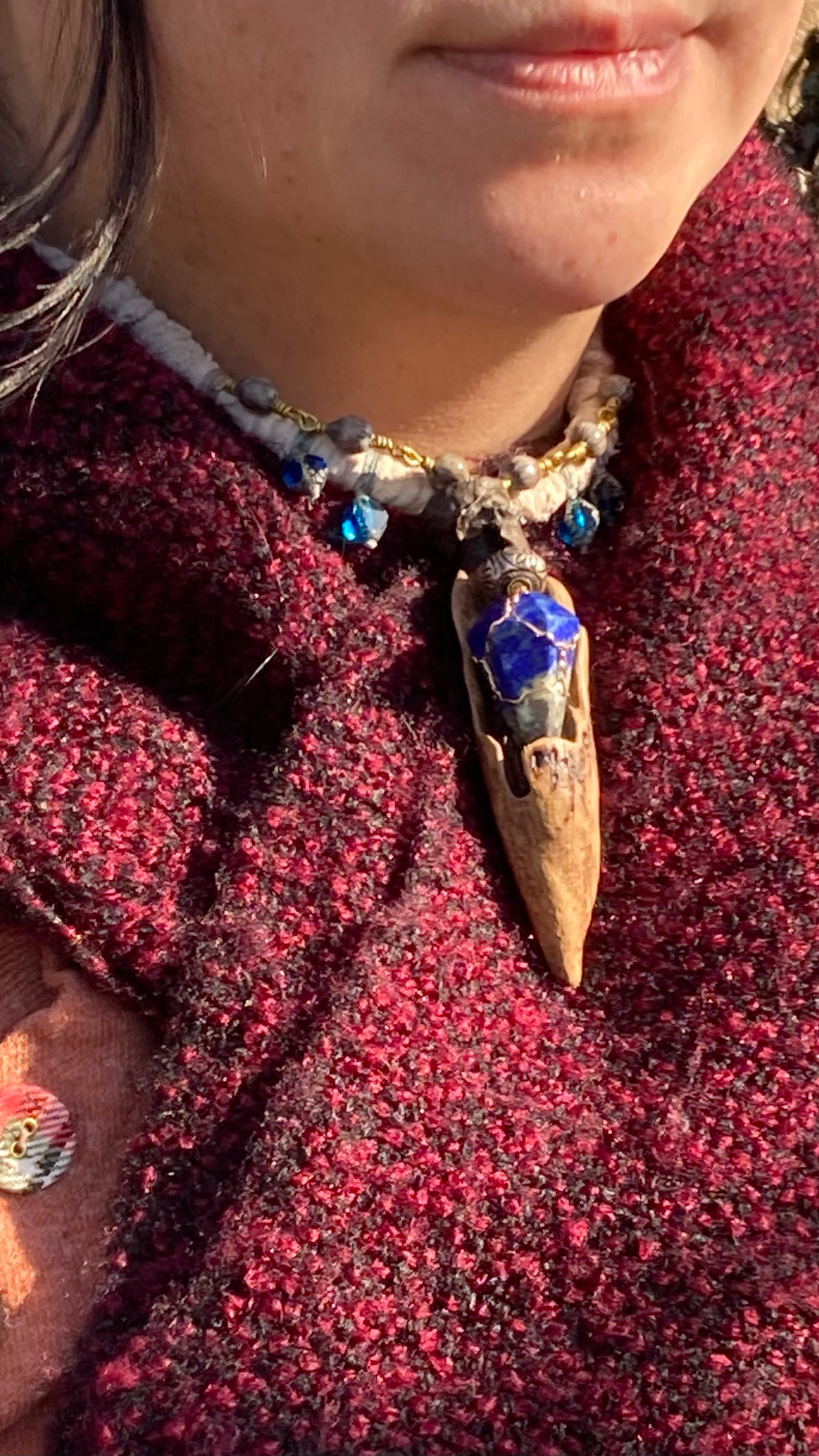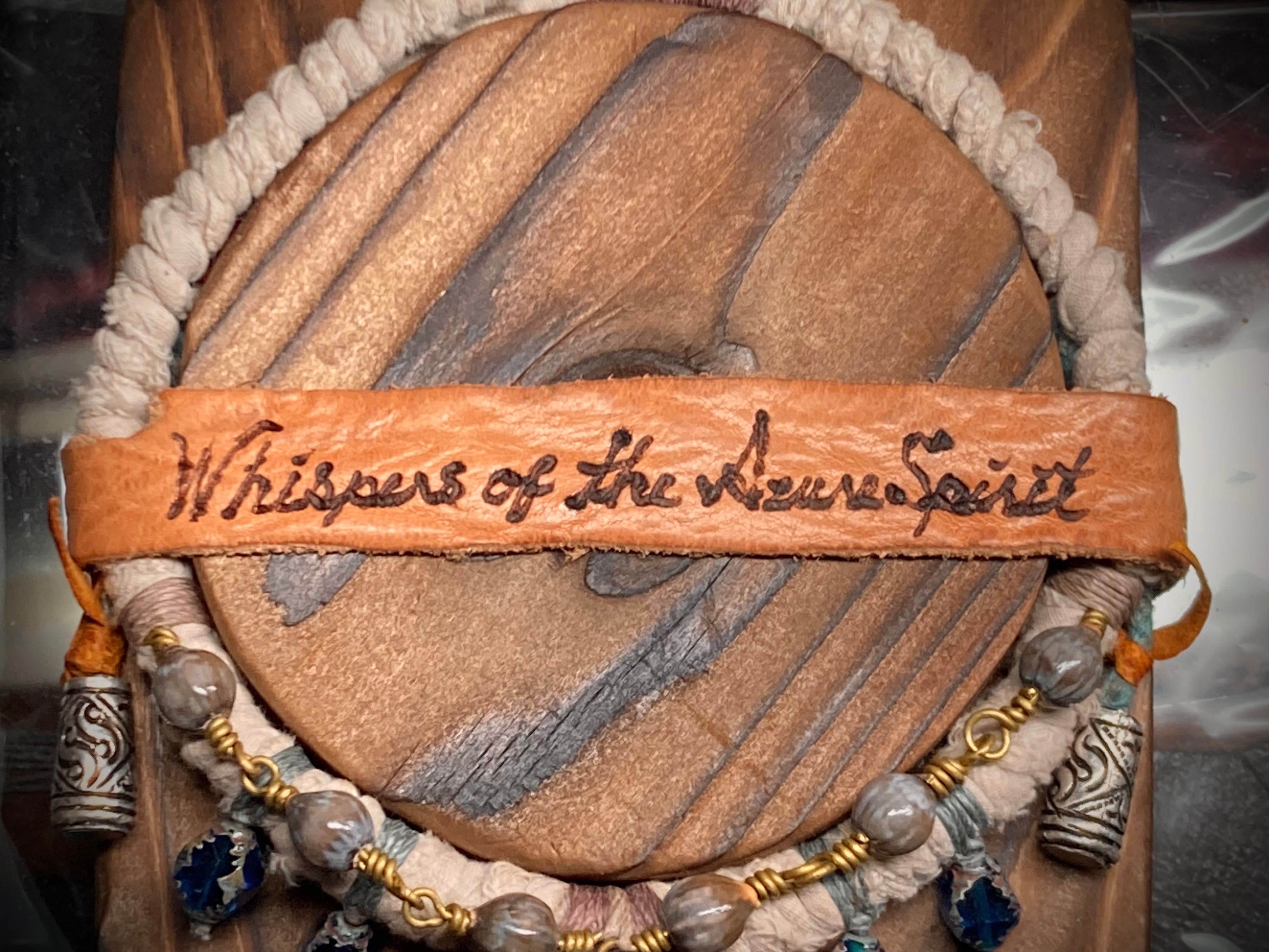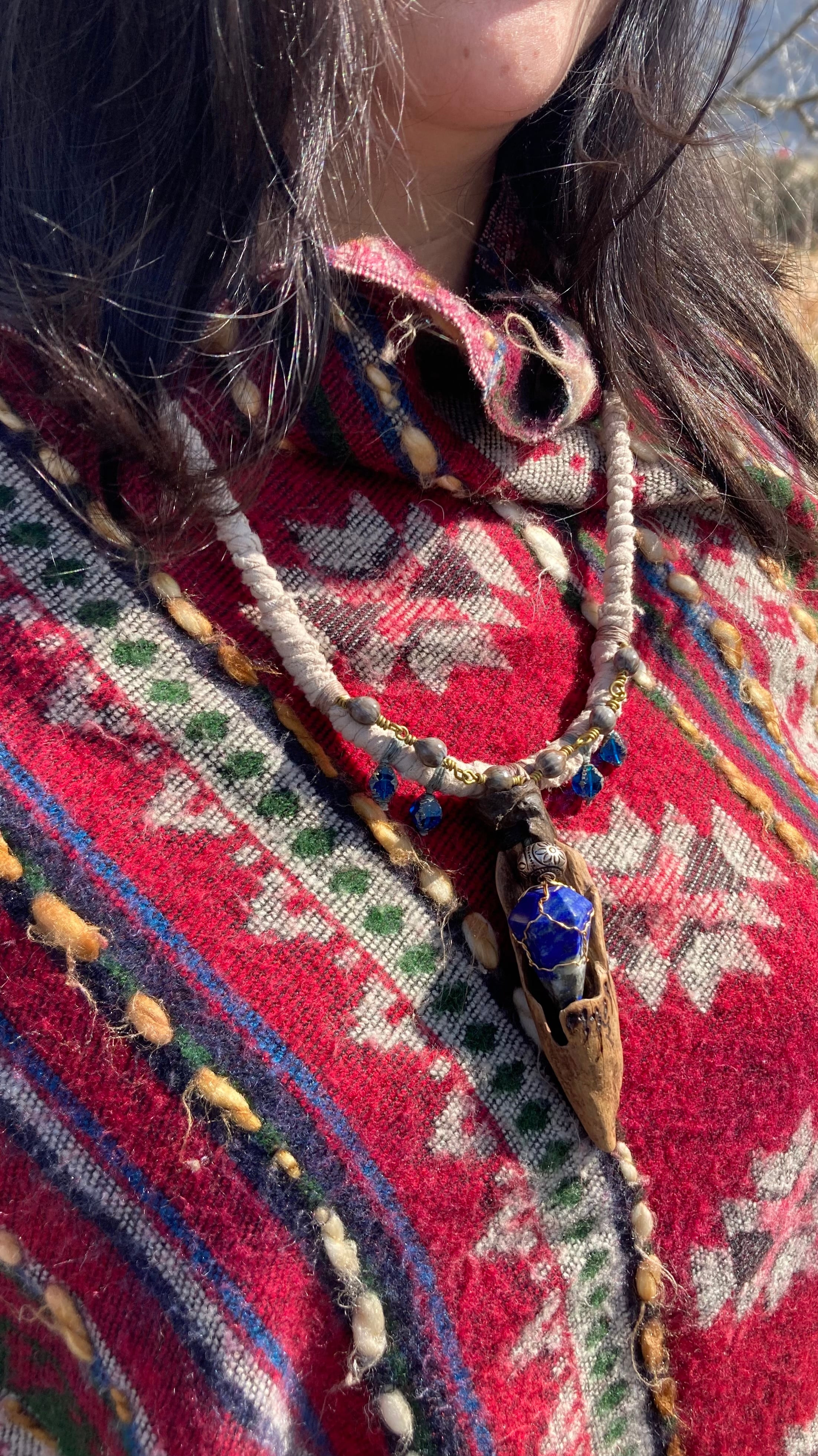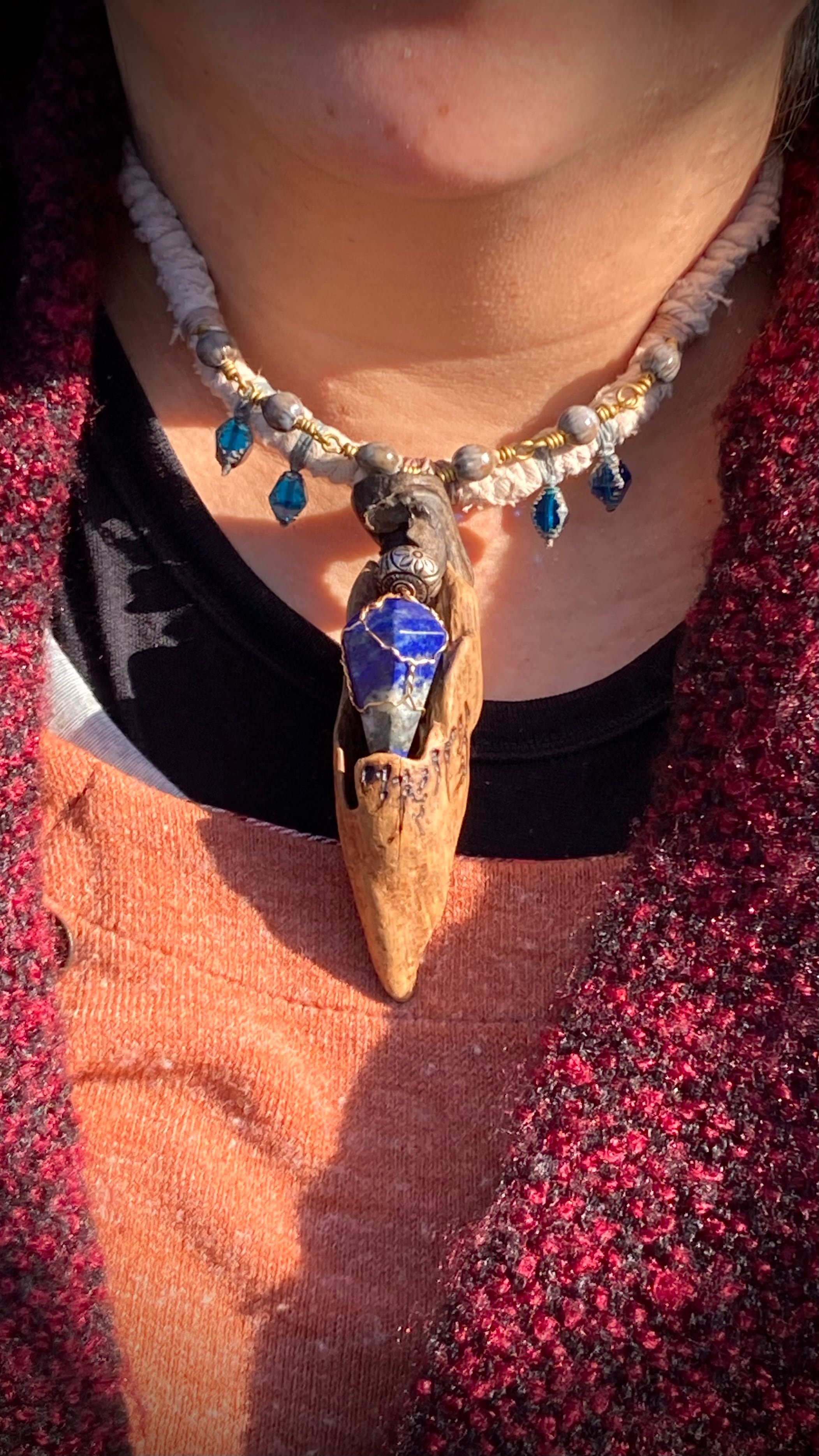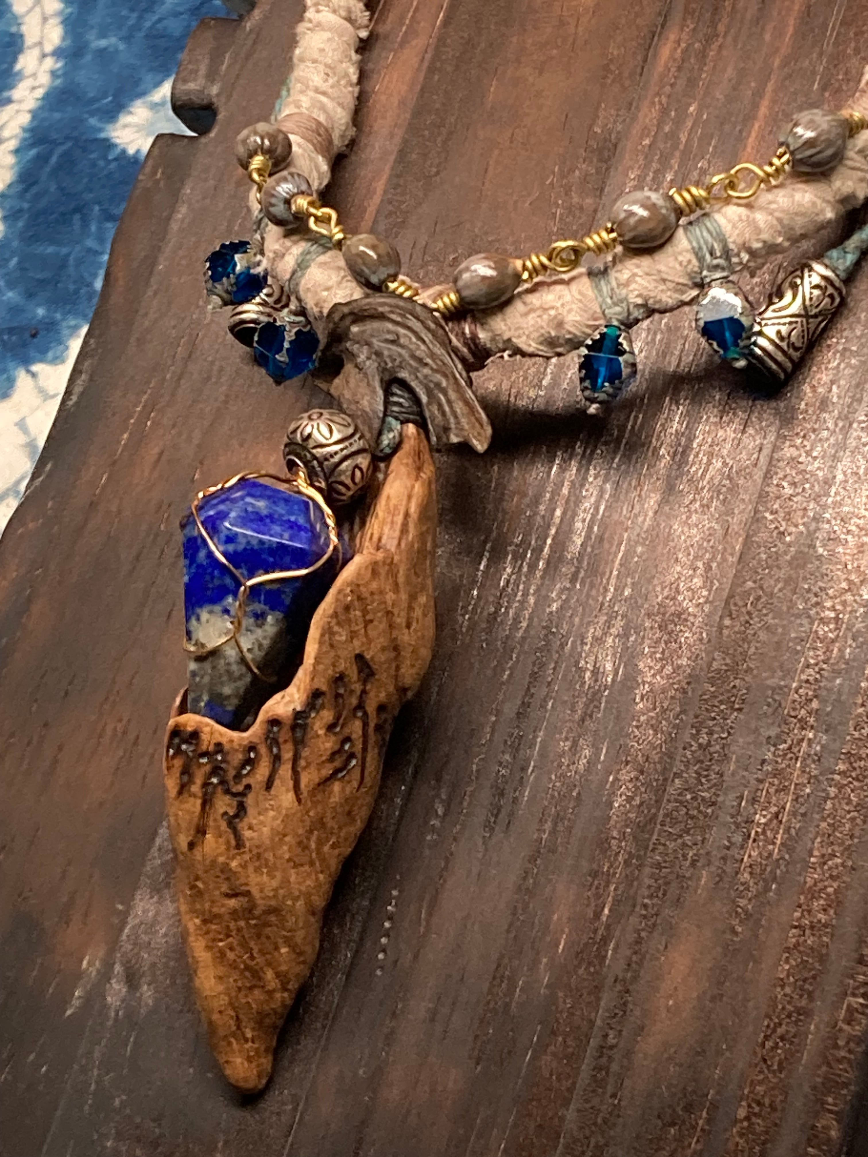 A hand-twisted cord, wrapped with fragments of aged cloth, and adorned with just a few beads and silver parts. It balances humble textures with quiet power.