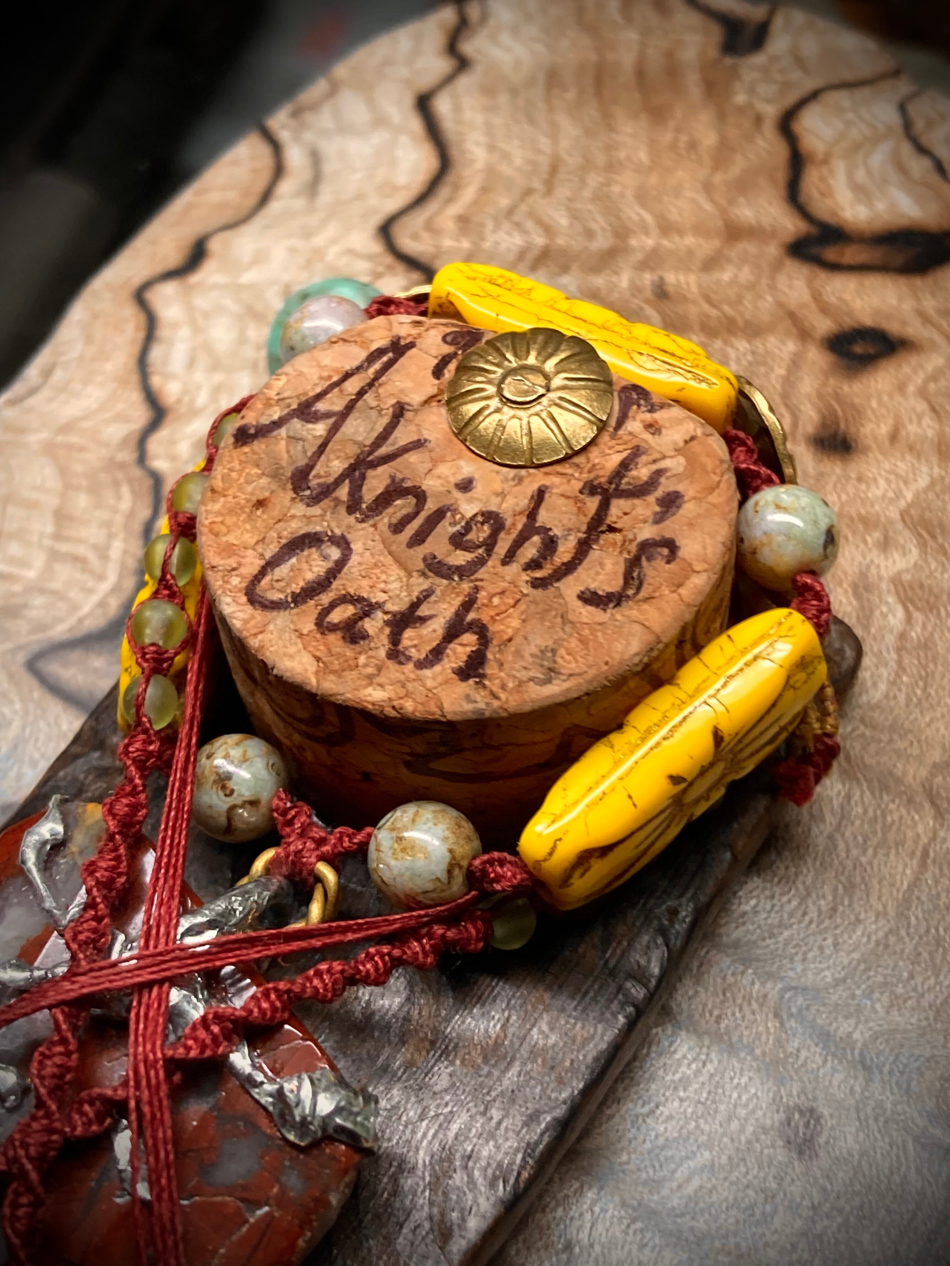 Material used... Red Jasper, tin, linen thread, silk thread, Czech beads